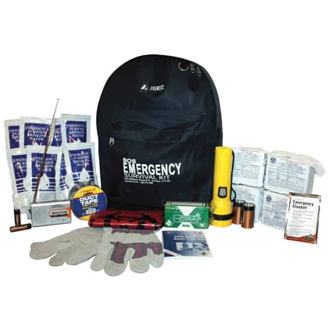 - Contains: Food, Water, Blanket, First Aid, Flashlight, Radio and more.