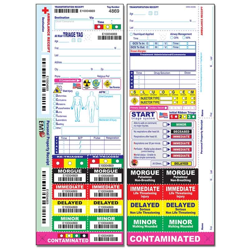 | Content | Optimized for use as a secondary assessment and patient tracking tool, the All Risk® Triage Tag provides treatment personnel the ability to document patient condition and care while awaiting transport. The enhanced transportation receipt, when used with the receipt holder, streamlines ambulance loading and ensures that patient number, acuity and destination are documented and available for quick reference.