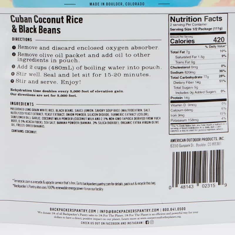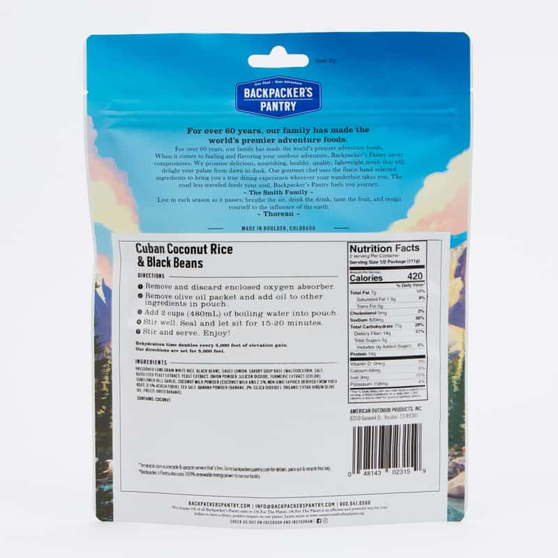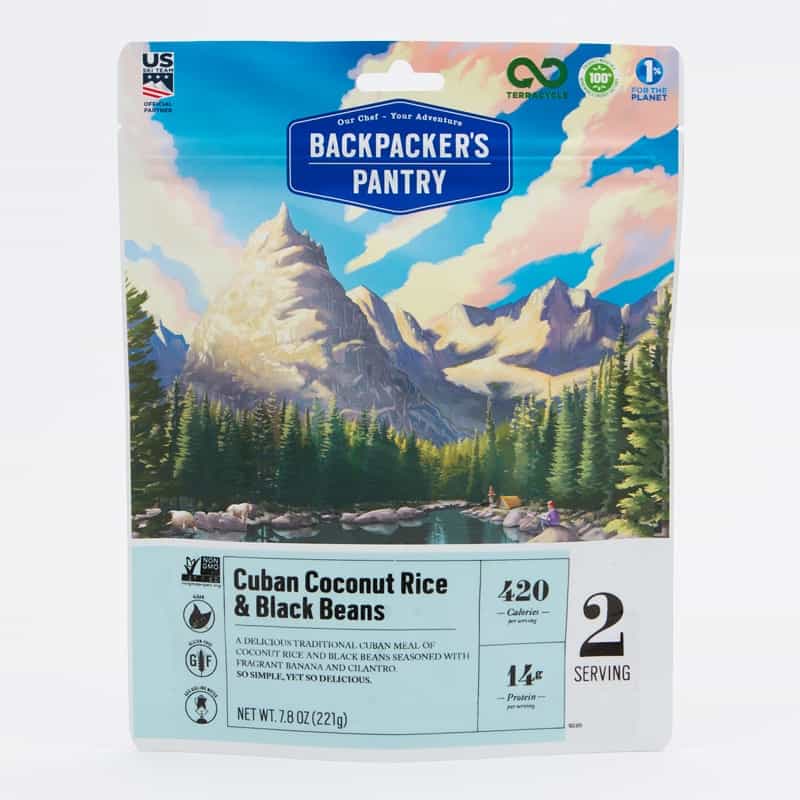 A delicious traditional Cuban meal of coconut rice, black beans fragrant banana and cilantro. Loved by all ages. Mild in flavor and great for those who avoid spicy food. Kids love this meal! Comes with a packet of extra virgin olive oil for you to add to boost the calories and flavor. Non-gmo coconut milk and sea salt let you feel healthy on the trial backpacking, hiking or camping. This is a great tasting, vegan favorite meal. Perfect for vegan travelers and vegetarian travelers as it is gluten free, soy free, dairy free. A flavorful, high protein, convenient meal on a sailboat, hunting trip or on a big wall. Never eat airplane food again when you can pack a spoon and lightweight Backpacker’s Pantry gourmet, premium freeze dried meals. Just ask the flight attendant for 2 cups of hot water, wait 20 minutes and be prepared to fight off your fellow passengers. A favorite of kids and adults. Rated 5 stars. A perfect side dish at home or in the ski lodge when you combine it with a protein of your choice. A no mess, healthy, late night meal in the dorm room. Easy to digest & easy to prepare. Enjoy the delicious flavor of Cuba anywhere. Three year shelf life lets you be prepared for any emergency. Soy free. | The