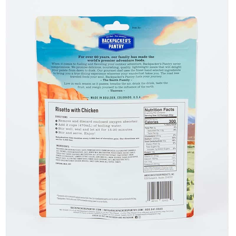 PRECOOKED LONG GRAIN WHITE RICE, SAUCE (PARMESAN CHEESE (PARMESAN CHEESE (CULTURED PART-SKIM MILK, SALT, ENZYMES), DISODIUM PHOSPHATE, SALT), NONFAT MILK, MALTODEXTRIN, POTATO STARCH, SEA SALT, GARLIC, TORULA YEAST, SAVORY SOUP BASE (MALTODEXTRIN, SALT, AUTOLYZED YEAST EXTRACT, YEAST EXTRACT, ONION POWDER, SILICON DIOXIDE, TURMERIC EXTRACT (COLOR), SUNFLOWER OIL), ONION, DEXTROSE, SUGAR, BLACK PEPPER, PARSLEY, BASIL, GLUTEN-FREE TAMARI SAUCE (TAMARI SAUCE (SOYBEANS, SALT), MALTODEXTRIN, SALT)), FREEZE-DRIED WHITE CHICKEN MEAT, BROCCOLI, SWEET CORN, ONION, BELL PEPPER, TOMATO. Description
