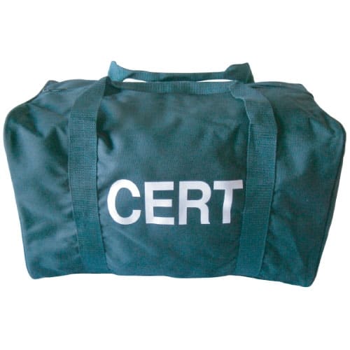 - Green bag with white printed CERT lettering on front pocket