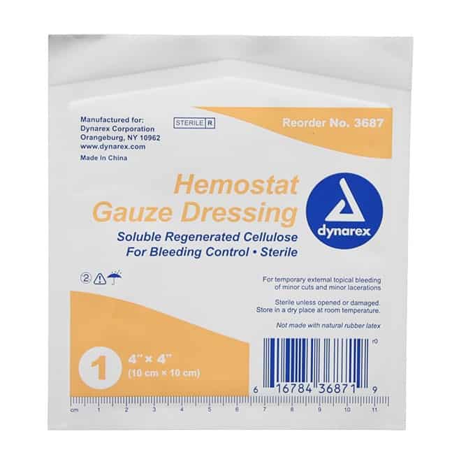 - Upon contact with blood, the hemostat gauze instantly converts to a glucose gel which expands to cause direct pressure on blood vessels and control bleeding