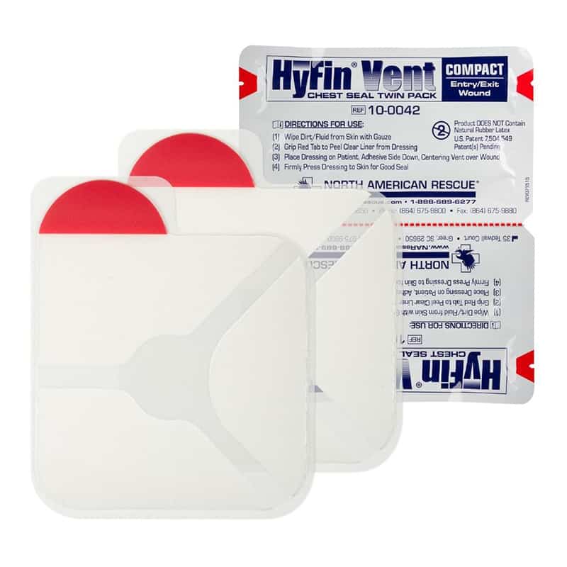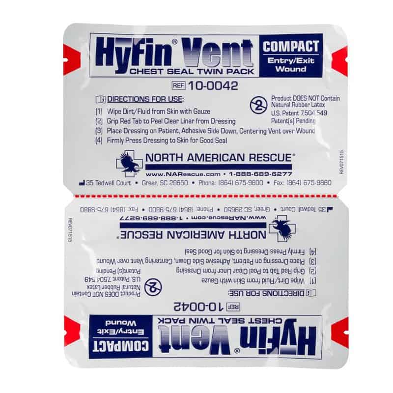 | Content | The HyFin Chest seal sets the standard for the prevention, management and treatment of an open and/or tension pneumothorax potentially caused by a penetrating chest trauma. Two seals, each individually packaged, are designed to allow the user to apply a seal to both an entry or an exit wound while also giving the option to only apply one and store the other until need as the situation requires. This innovative design provides 3-vented channels designed to prevent airflow into the chest cavity during inhalation while allowing air to escape through the vent channels during exhalation. The 3-vent channels are designed to allow blood to escape and also provide a backup fail-safe system, as even if two of the three channels become obstructed, the vent is designed to remain fully operational.