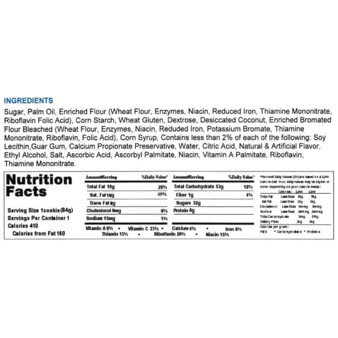 INGREDIENTS: Sugar, Enriched Wheat Flour, Palm Oil, Corn Starch, Wheat Gluten, Dextrose, Desiccated Coconut preserved with Sodium Metabisulfite, Corn Syrup, Contains less than 2% of each of the following: Soy Lecithin, Guar Gum, Calcium Propionate as a preservative, Citric Acid, Salt, Ascorbic Acid, Ascorbyl Palmitate, Niacin, Vitamin A Palmitate, Riboflavin, Thiamine Mononitrate.