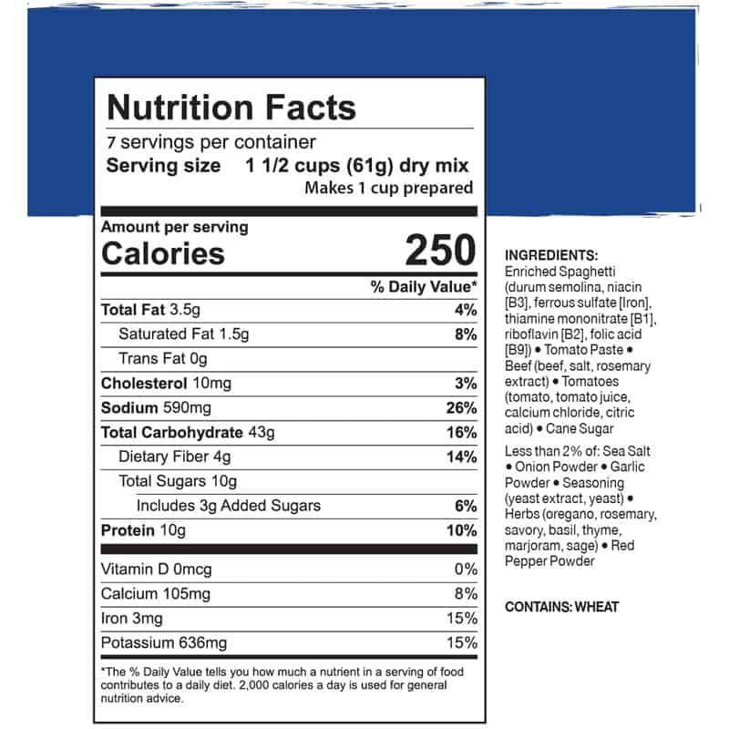 Enriched Spaghetti (durum semolina, niacin [B3], ferrous sulfate [Iron], thiamine mononitrate [B1], riboflavin [B2], folic acid [B9]) ● Tomato Paste ● Beef (beef, salt, rosemary extract) ● Tomatoes (tomato, tomato juice, calcium chloride, citric acid) ● Cane Sugar ● Less than 2% of: Sea Salt ● Onion Powder ● Garlic Powder ● Seasoning (yeast extract, yeast) ● Herbs (oregano, rosemary, savory, basil, thyme, marjoram, sage) ● Red Pepper Powder