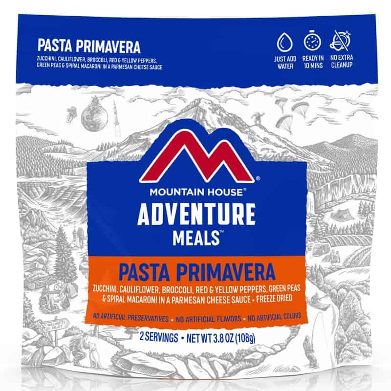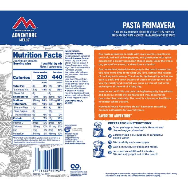 Looking for a hearty vegetarian dish that can be whipped up in minutes? Mountain House Pasta Primavera blends spiral macaroni with broccoli, peppers, cauliflower, and zucchini in an irresistible Parmesan cheese sauce for a deliciously filling meal that's perfect to take on the road or enjoy at home. | Easy