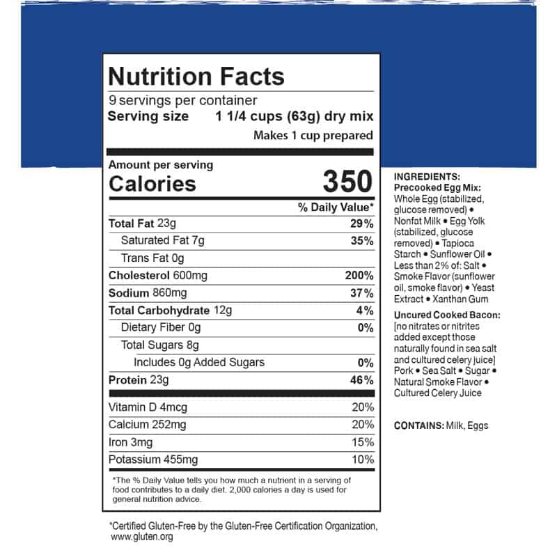 Precooked Egg Mix: Whole Egg (stabilized, glucose removed), Nonfat Milk, Egg Yolk (stabilized, glucose removed), Tapioca Starch, Sunflower Oil, Less than 2% of: Salt, Smoke Flavor (sunflower oil, smoke flavor), Yeast Extract, Xanthan Gum, Uncured Cooked Bacon: [no nitrates or nitrites added except those naturally found in sea salt and cultured celery juice] Pork, Salt, Sugar, Natural Smoke Flavor, Cultured Celery Juice Description