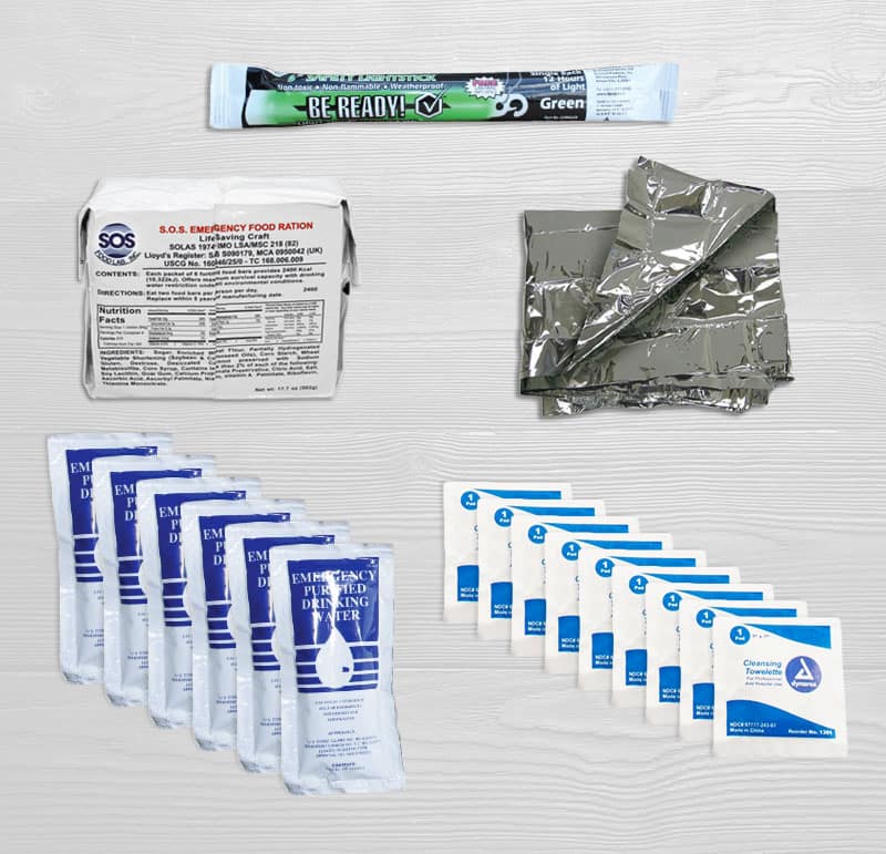 Instruct your student to keep one in an easily accessible place in his or her room while keeping another in the car. In case of an emergency, this kit will provide six 4.227-oz. U.S. Coast Guard-approved water packages, each with a five-year shelf life, an emergency blanket, one glow stick, nine wet wipes and a 2,400-calorie food bar.