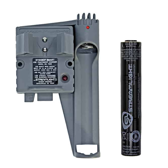 | Streamlight 75100. Recharges in 10 hours. Fits all Stinger flashlight styles and UltraStinger. | USB Lithium Ion button top rechargeable battery with integrated micro-USB charge port is an economical alternative to disposable CR123 cells for the latest Streamlight flashlights that are designed to accept both. The integrated USB charge port with LED status lights can recharge the battery in 5 hours.