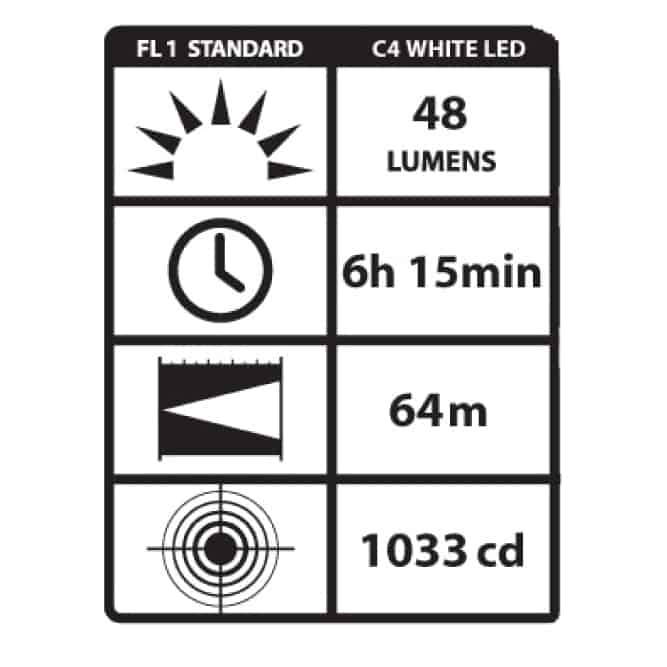 Spot - 140 lumens; 171m beam; runs 18 hours Flood - 140 lumens; 18m beam; runs 18 hours Simultaneous Spot & Flood - 245 lumens; runs 9 hours Switch: