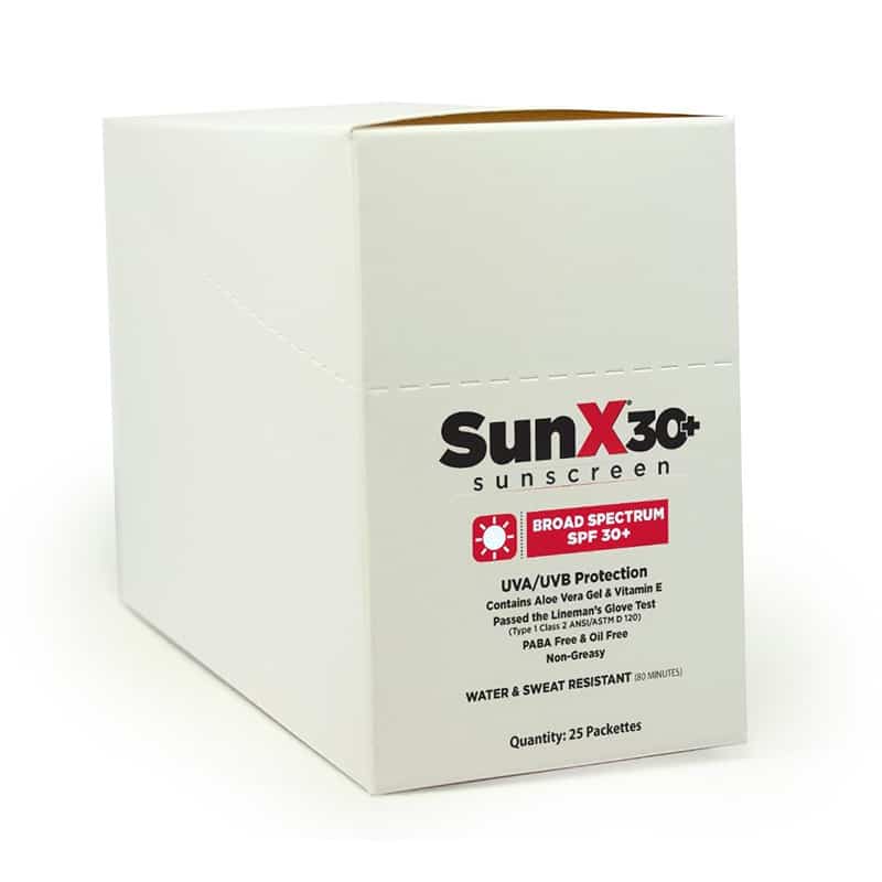 | Content | 25 foil packs of sunscreen that is PABA free and Oil free. Lasts in water and sweat for 80 minutes. SunX30+ Sunscreen Lotion with Broad Spectrum SPF30 that blocks UAV/UVB rays and contains aloe vera gel and vitamin E.